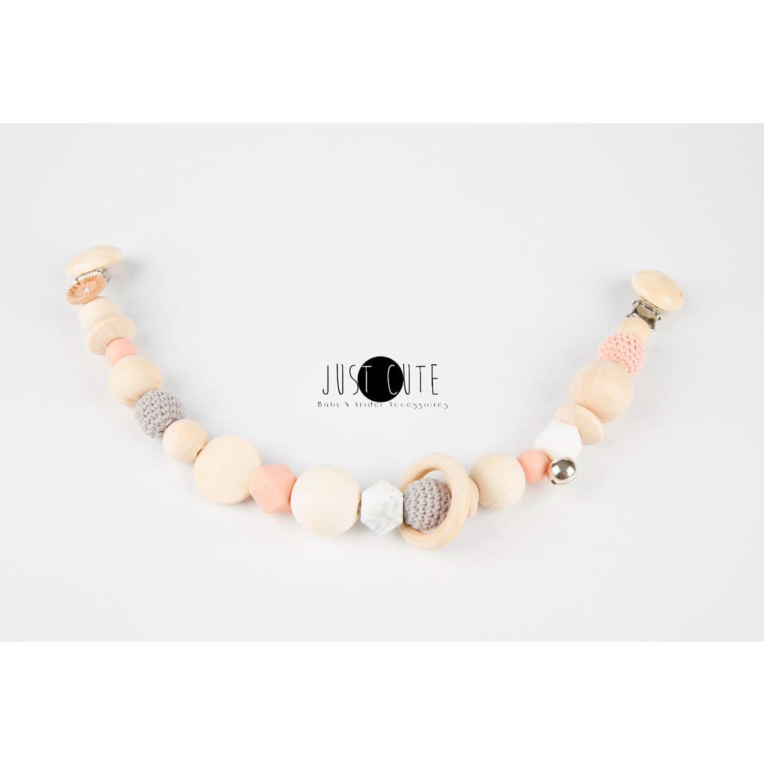 Con questa catenella  da passeggino di Just Cute nei colori grigio chiaro, pesca e marmo, puoi trasformare la carrozzina del tuo bambino o Maxi-Cosi in un esemplare trendy. Se lo si desidera, si può abbinare questa catenella da passeggino insieme all’anello da dentizione in legno, al portaciuccio o alla giostrina pendente di Just Cute negli stessi colori.