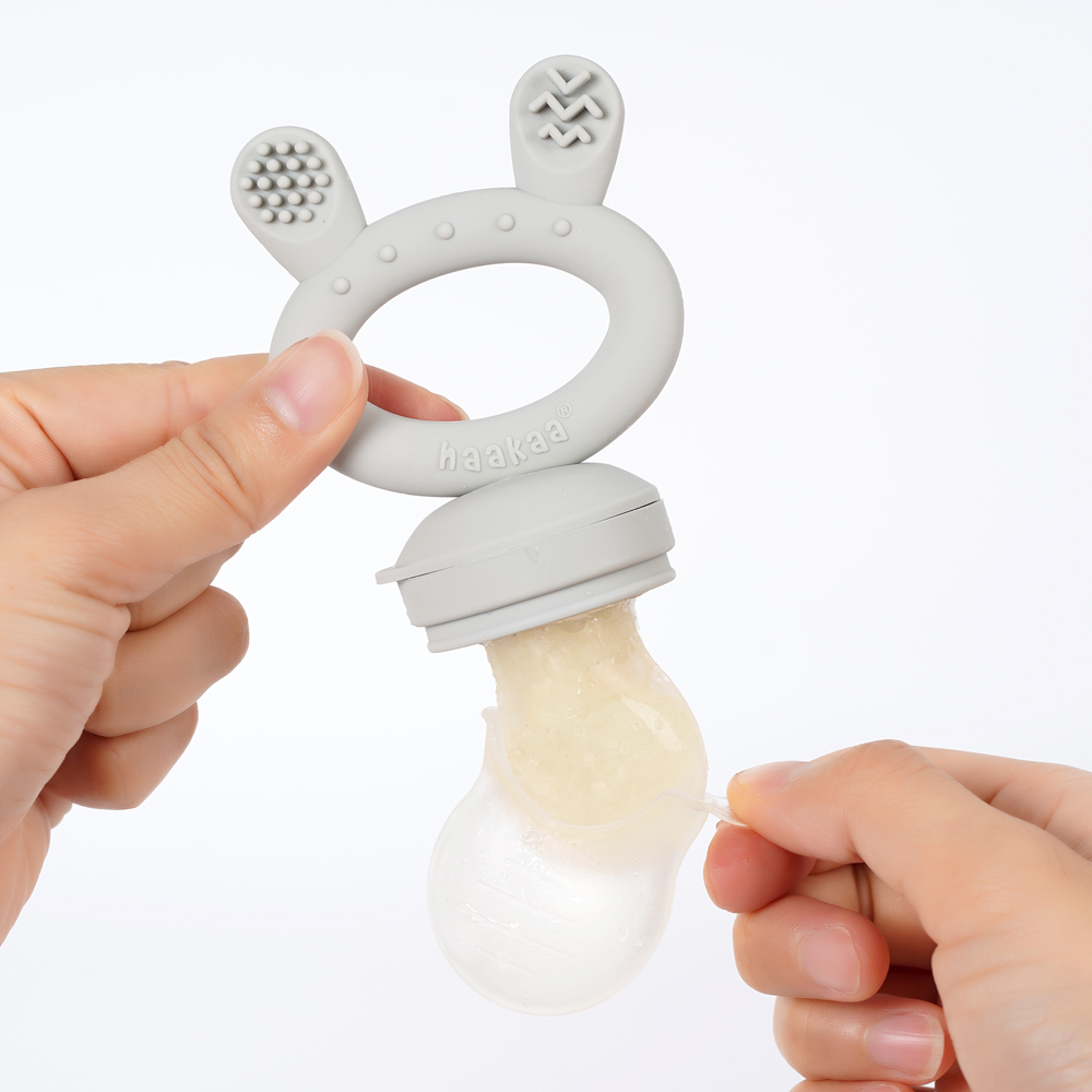 Il ciuccio per la frutta di Haakaa, invece, è semplicissimo da montare e utilizzare! Metti semplicemente frutta, verdura o carne nel sacchetto di silicone e chiudilo ermeticamente. Puoi anche congelare le prelibatezze direttamente nell’apposita custodia fornita insieme al ciuccio per la frutta. Per fare ciò, è sufficiente mettere la custodia, versarci il liquido (es. latte materno o purè), montare la il ciuccio, mettere il coperchio e congelare! Dopo il congelamento, tutto ciò che devi fare è rimuovere il coperchio e lasciare che il tuo bambino esplori! Il tuo bambino si divertirà ad esplorare nuovi sapori e superfici incoraggiando l’indipendenza, imparando a nutrirsi e migliorando la coordinazione occhio-mano e le capacità motorie.
