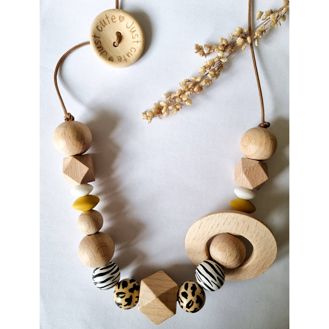 La collana di allattamento è facile da pulire con un panno umido. Una salvietta per neonati, ad esempio, è adatta a questo. – Non bagnare il legno.