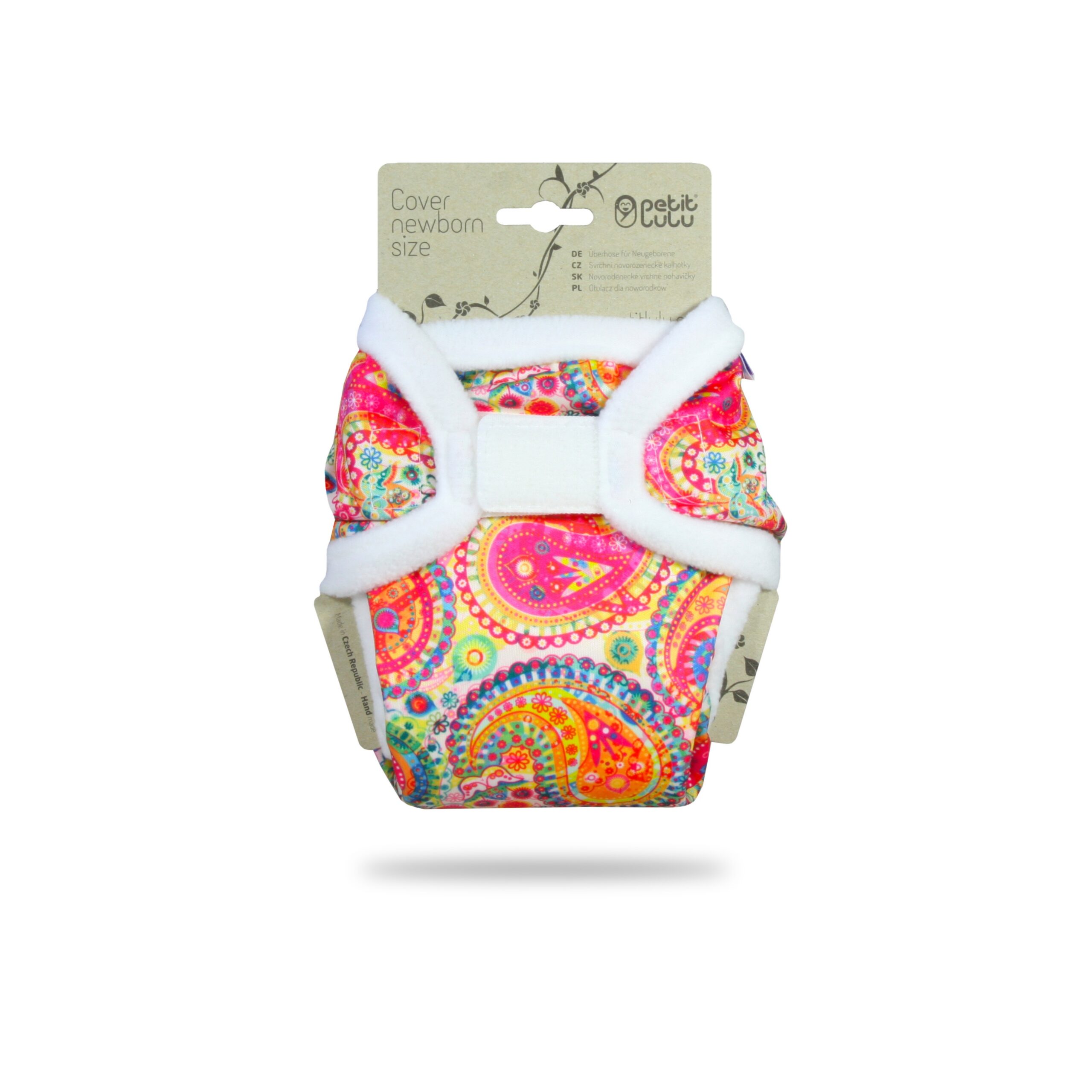 Questa cover per neonato di Petit Lulu ha bordi in morbido pile su gambe e pancia. Di conseguenza, i bambini non ottengono smagliature. La cover newborn è adatta a bambini da 2 a 6 kg e si chiude con il velcro.  Si mette sopra un fitted oppure un prefold taglia neonato di Petit Lulu o di un altro marchio.