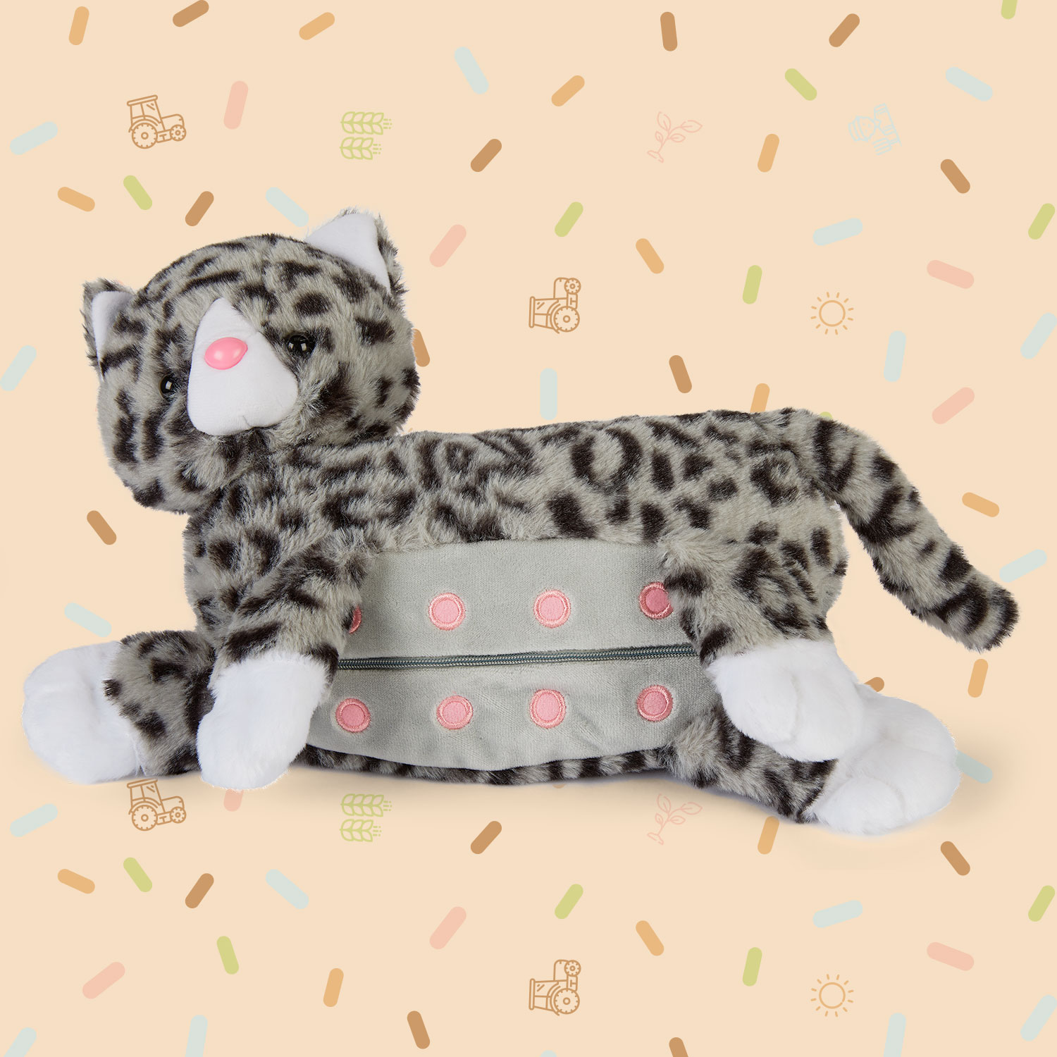 Materiale: realizzato in Velboa, Raso e Velluto. L’animale madre include una cerniera, magneti e occhielli a bottone. I bebè animaletti hanno una calamita cucita nel muso.