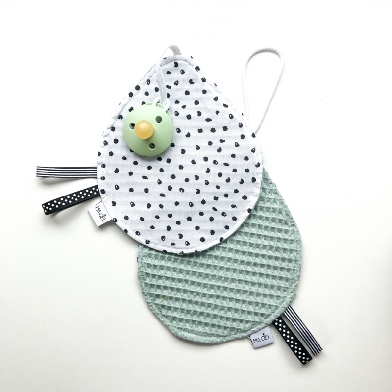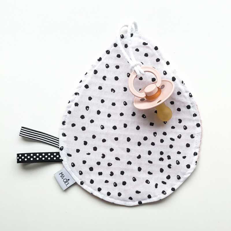 Panno ciuccio a forma di goccia con sfondo bianco e puntini neri.