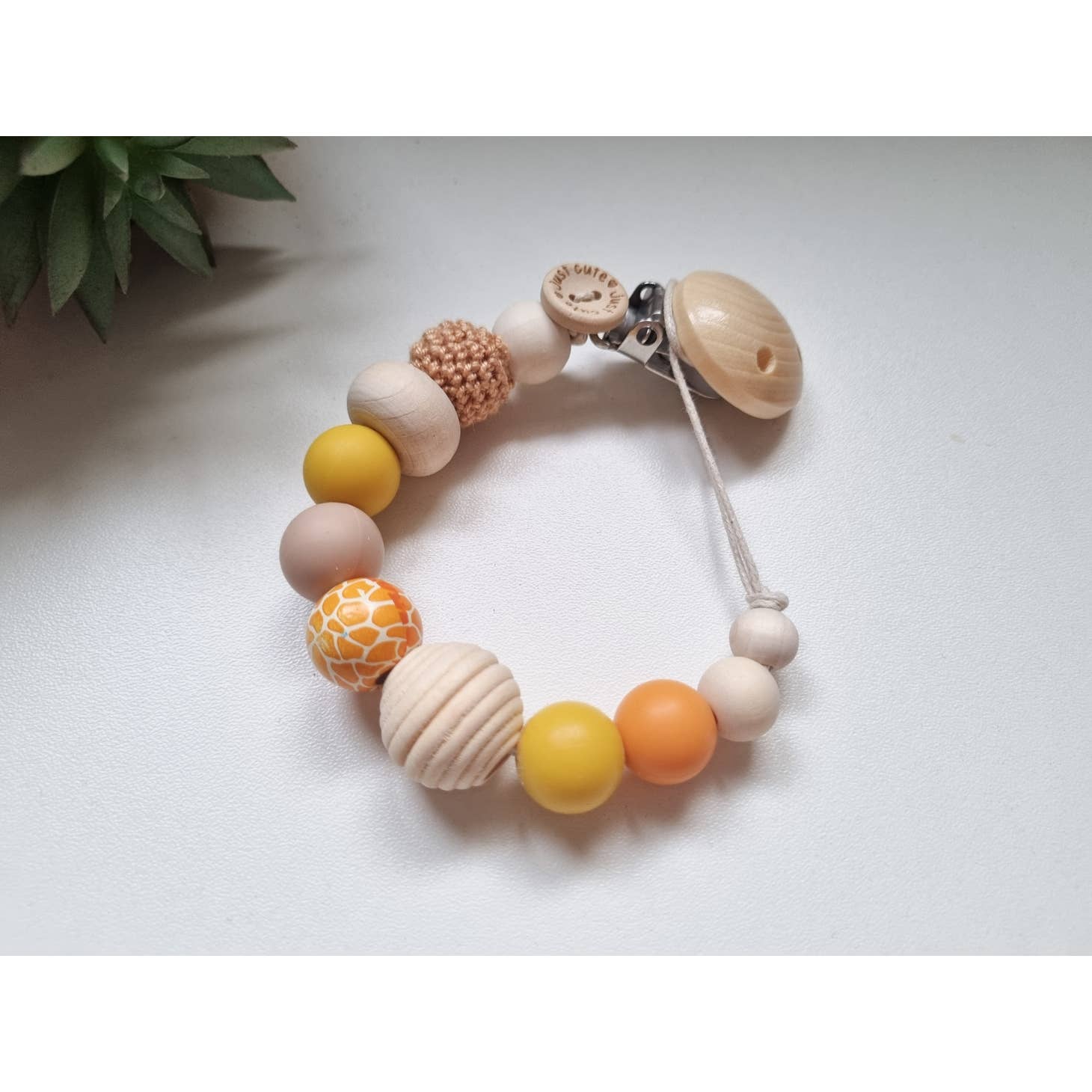 Con questo portaciuccio in legno combinato con silicone e perline all’uncinetto, il tuo piccolo è tutto alla moda.