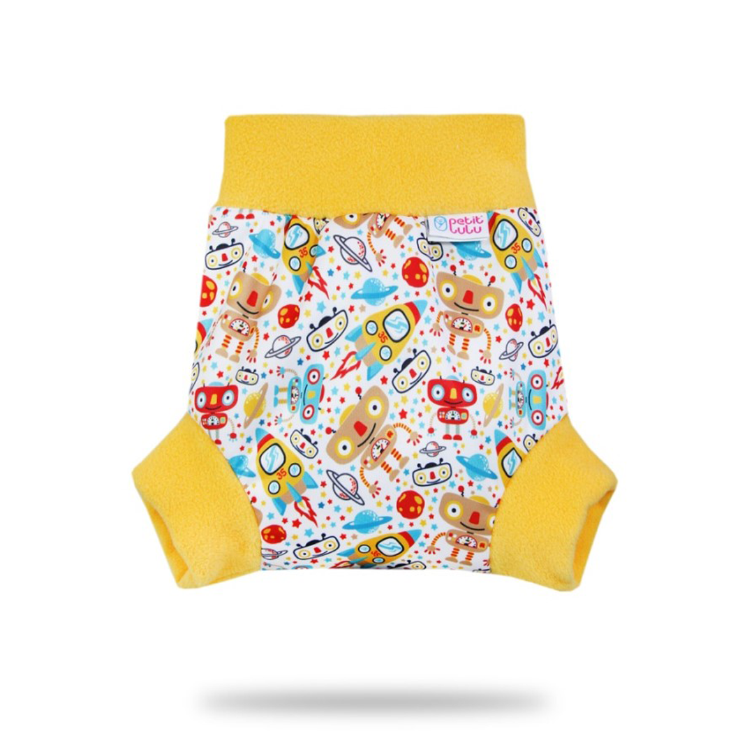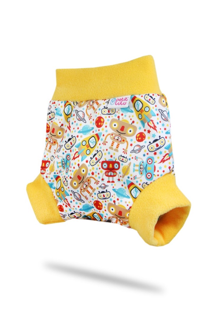 Questa comoda cover pull-up Petit Lulu ha morbidi e ampi bordi in pile sulle gambe e sulla pancia. Il fondo non ha chiusura e si indossa come mutande. La cover pull-up è quindi molto adatta per chi dorme sullo stomaco, che con altri cover  si bagnerebbe troppo velocemente. Questa cover può essere utilizzata anche durante il giorno. Grazie al doppio strato di PUL, questo pantaloncino pull-on è molto resistente alle perdite. La cover è disponibile in quattro taglie diverse. Le misure sono approssimative e dipendono dalla corporatura del tuo bambino. È meglio avere una cover un po’ troppo grande che troppo piccola. Qui sopra puoi scegliere la misura che vuoi ordinare.
