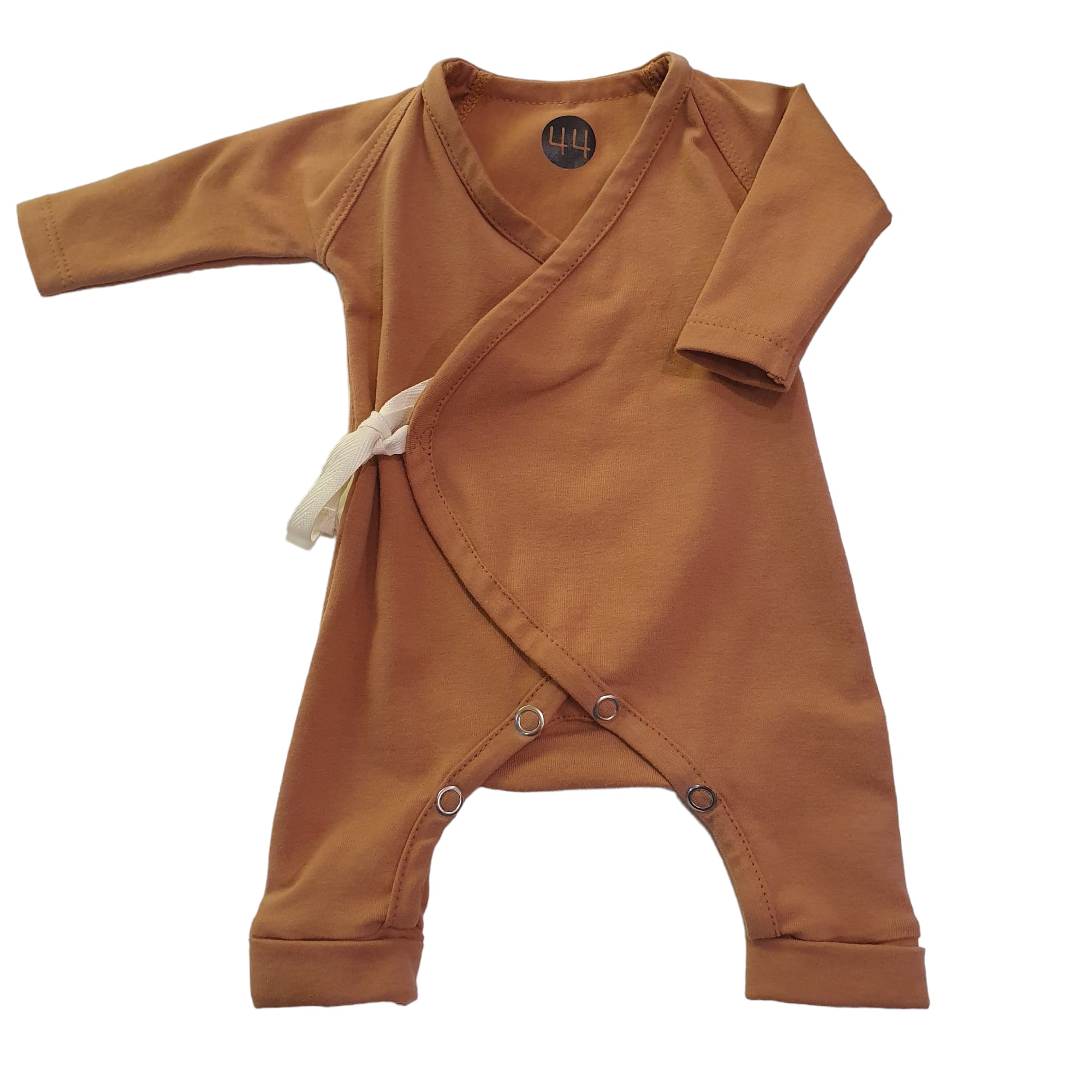 Tutina in cotone biologico super morbido e carino. Chiusura con un dolce fiocco e realizzata in un color marrone. Il tessuto utilizzato per questo body è realizzato in morbido jersey di buona qualità con certificato organico GOTS. La composizione del tessuto è 95% cotone e 5% lycra.