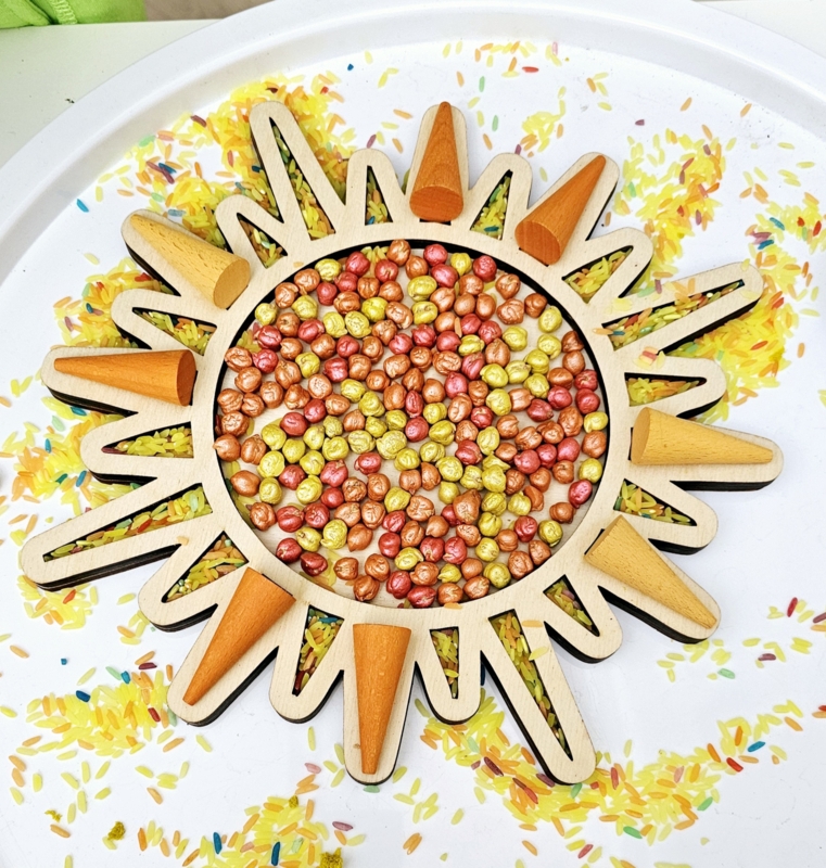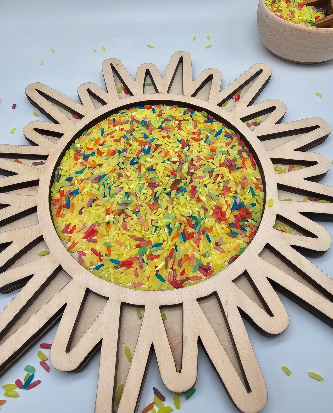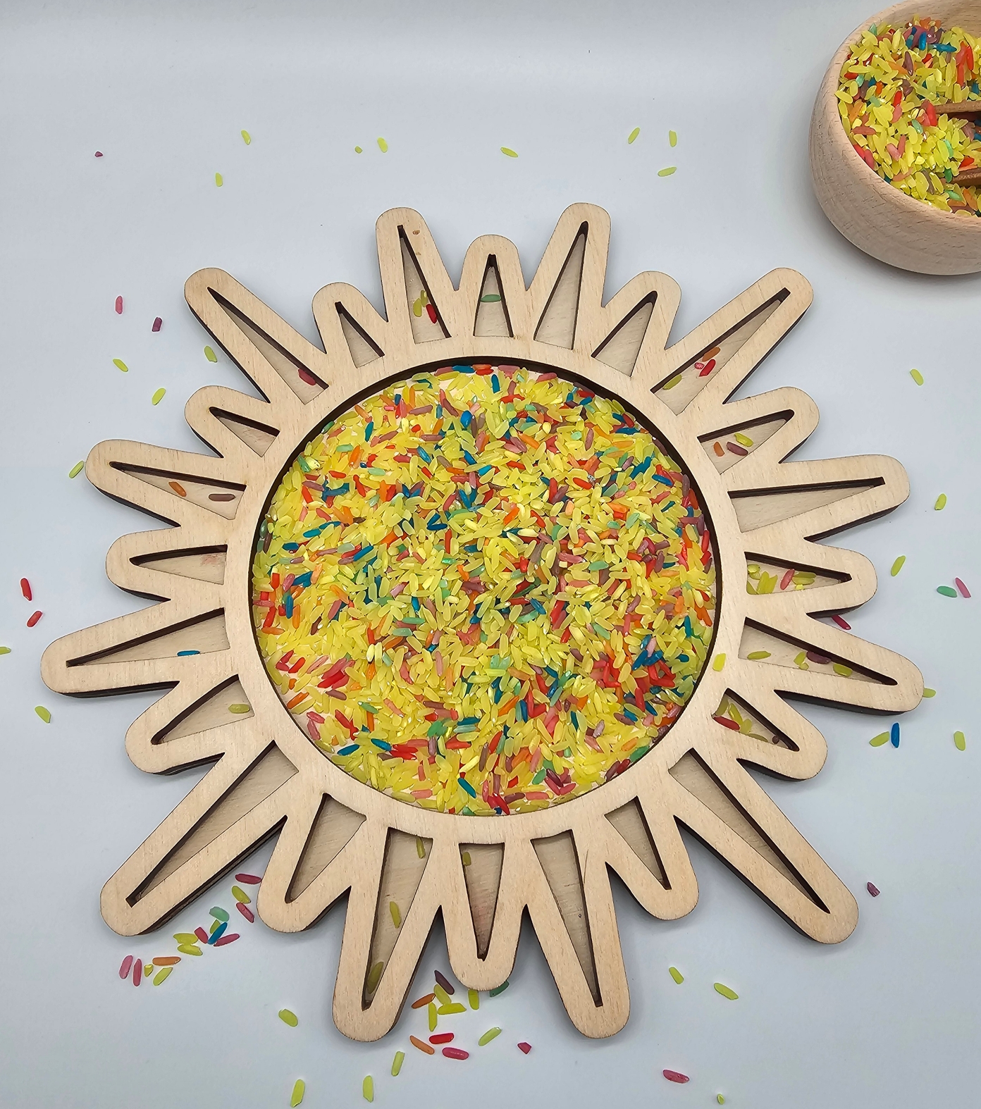 Questo è un bellissimo SensoryTray in legno per grandi e piccini! Un grande sole in legno con molte parti che puoi riempire con sabbia, riso, ceci, ecc. Non solo ottimo per la coordinazione occhio-mano, ma anche ottimo per rilassarsi.